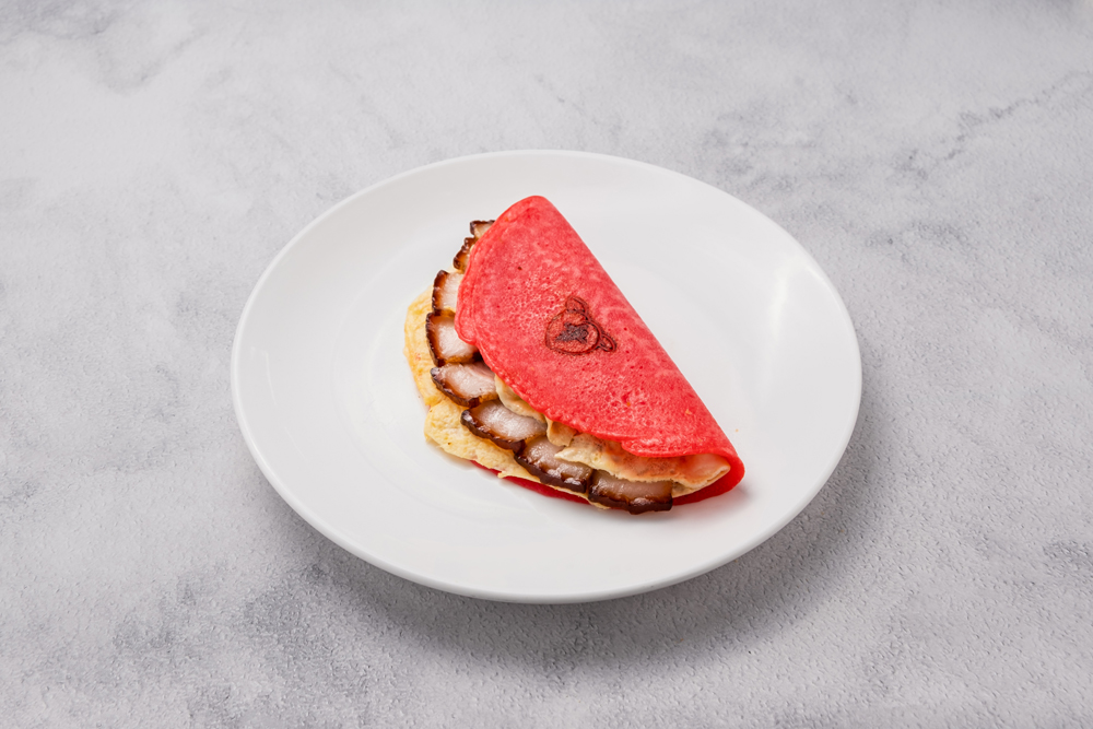 ● 豚ももの柔らかい部分を煮込んだチャーシューを縁起のいい赤い生地で包み、縁起がいい「壽桃」の焼き印を押した “蹄膀肉蛋餅(チャーシュークレープ)”