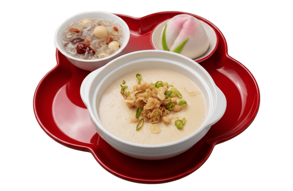 ● 台湾朝食の定番“鹹豆漿(おぼろ豆腐)”に披露宴定番の美容スイーツ“蓮子銀耳甜湯(蓮の実と白きくらげ)”と“壽桃(桃まんじゅう)”に婚約式で使う茶禮盆のセット“「囍」甜點早套餐(ダブルハピネス朝食セット)” ほか