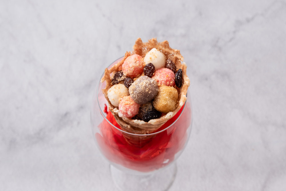 ● ワッフルコーンにホイップクリームと4色団子に干し葡萄とピーナッツ粉をトッピングしたスイーツ “花好月圓甜筒(彩色だんご練乳ワッフル)”
