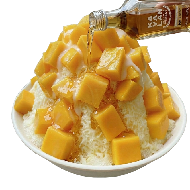 台湾フェスティバル™考案 “KAVALAN”マンゴーかき氷(噶瑪蘭芒果冰)10年で9つの世界最高タイトルを獲得し、世界中の専門家から極めて高い評価を得ている最高級ウィスキー“カバラン”で「囍(ダブルハピネス)」の祝宴に合わせ贅沢にミニボトル(50ml)を自分でかけて食べる“最高級の大人のマンゴーかき氷” ※毎日数量限定キンモクセイ烏龍茶(桂花烏龍茶)天然キンモクセイを使用し、優しい香りとスッキリした味わいの無糖烏龍茶